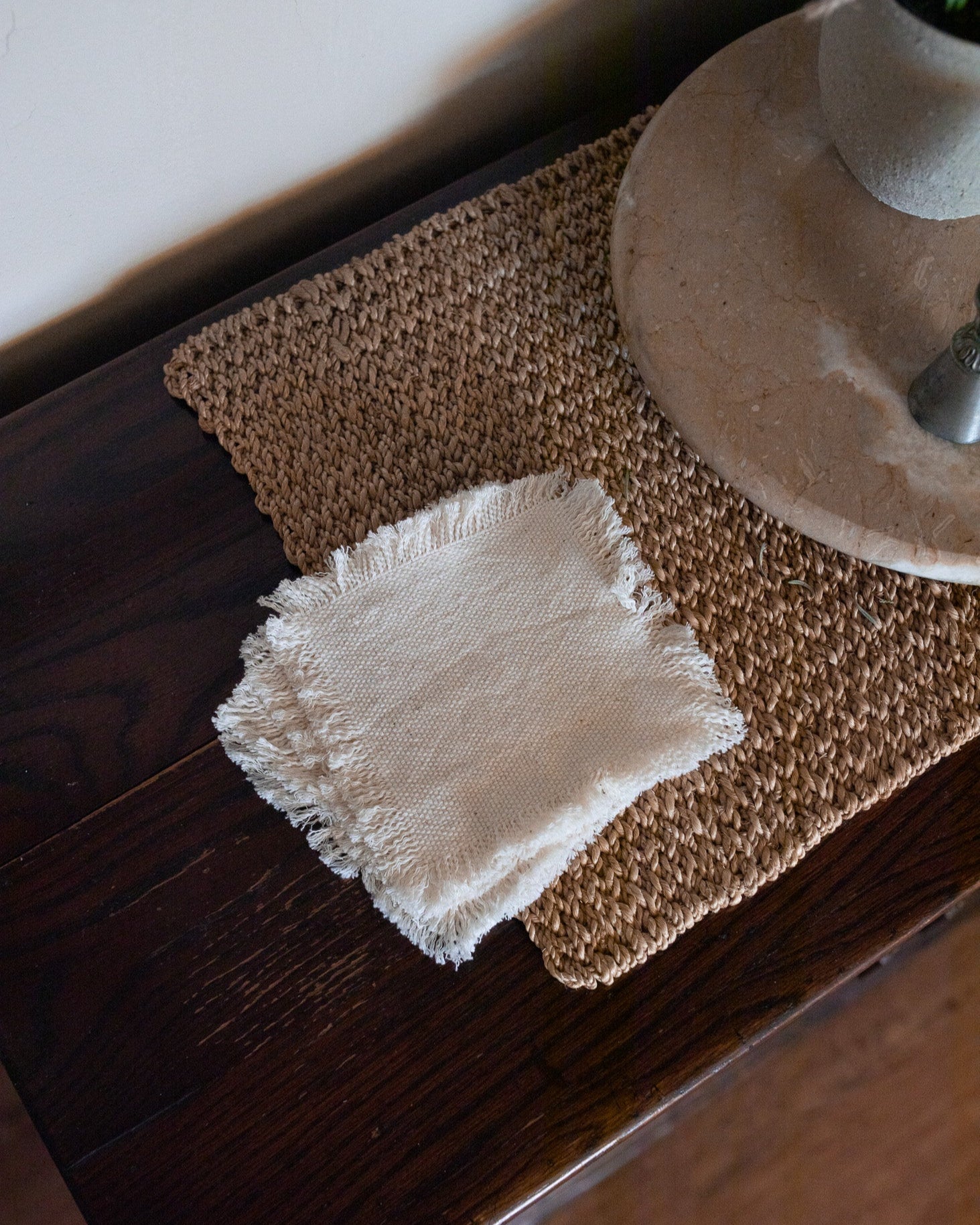This set of four 100% cotton coasters are hand-woven with undyed yarn that has been washed and pre-shrunk. Each coaster measures 5” x 5” and has a beautifully woven texture that makes any experience with a cocktail or wine glass even better.