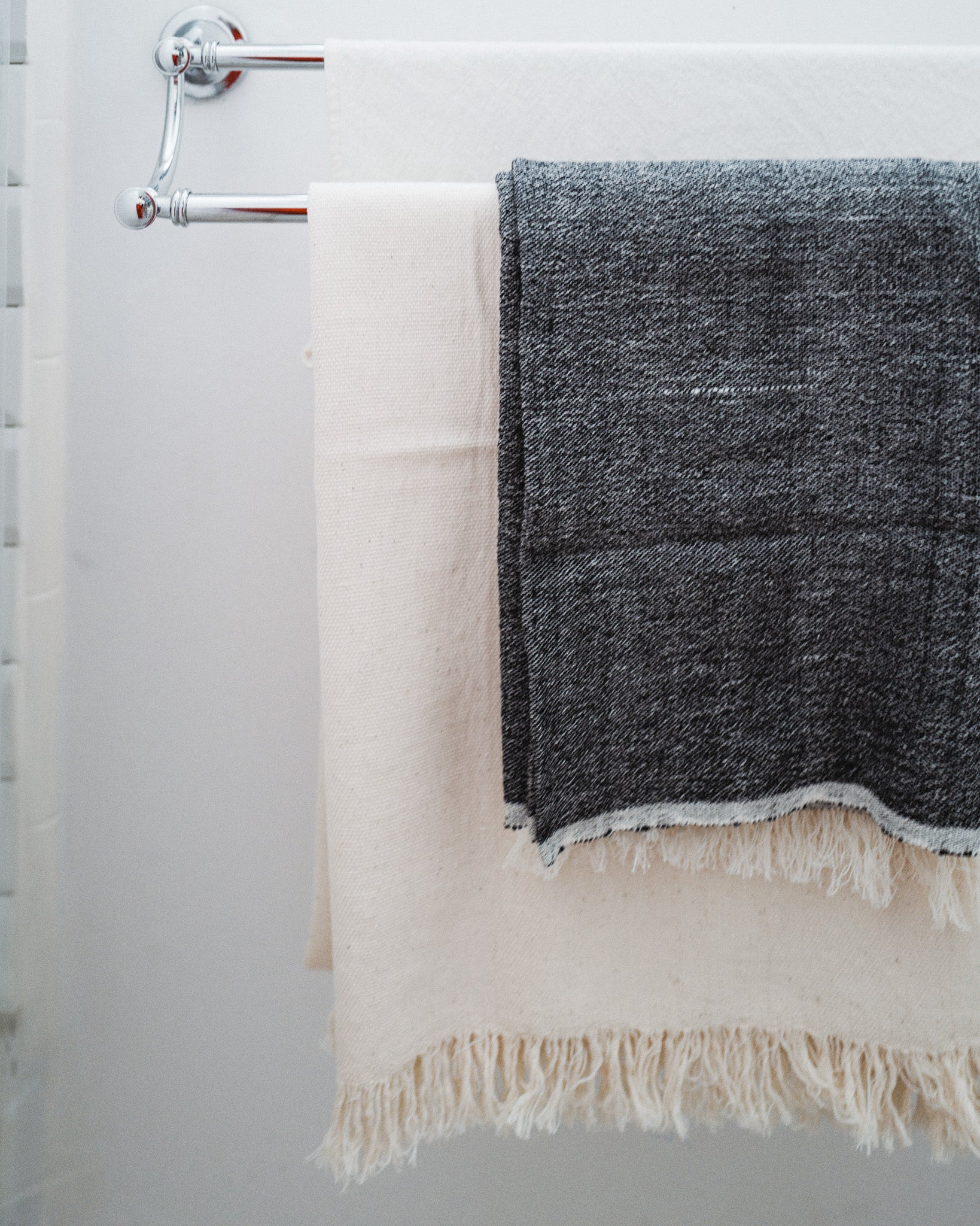 This 100% cotton towel is our largest size (40” x 70”) and hand-spun and woven by our artisan partners. The thicker weave naturally absorbs water and the 2 inches of hand-sewn fringe highlight its quality. Each versatile towel is washed and pre-shrunk to be the backbone of your bathroom or a thick, easy blanket.
