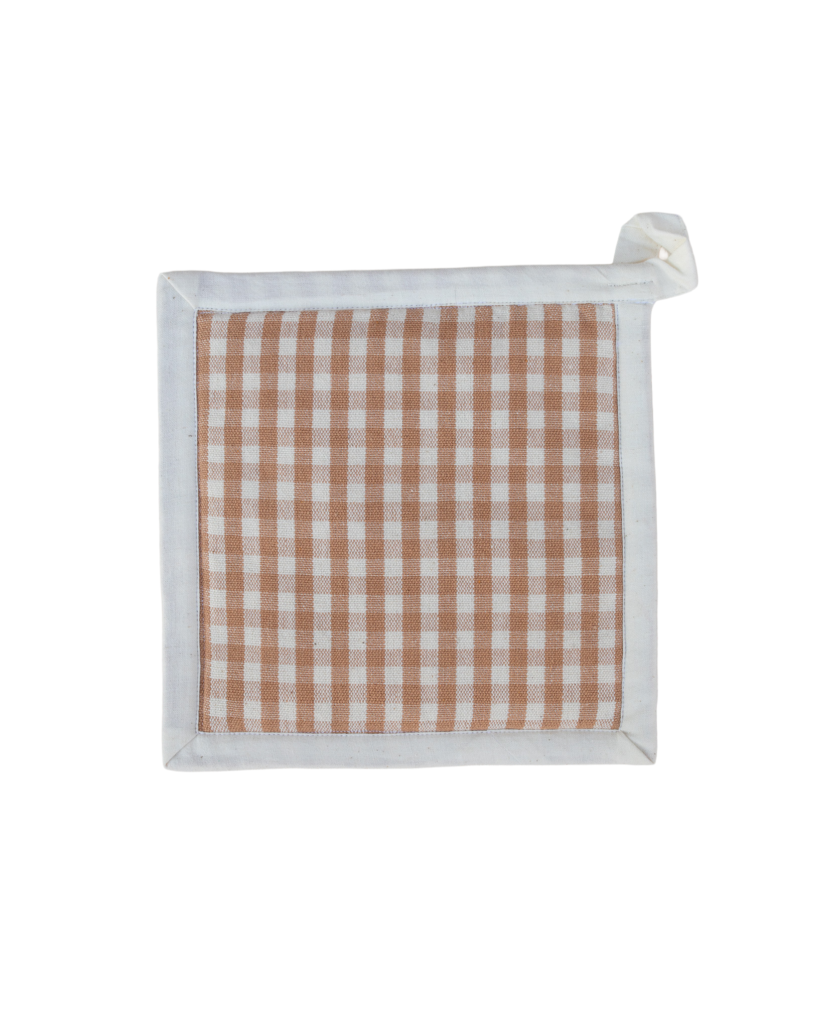 the home chefs in your life will love our gingham pot holders. triple lined for safe handling, & cute enough to leave out when hosting. bonus points if you give it with your favorite olive oil or wine! 8x8 and organic cotton.